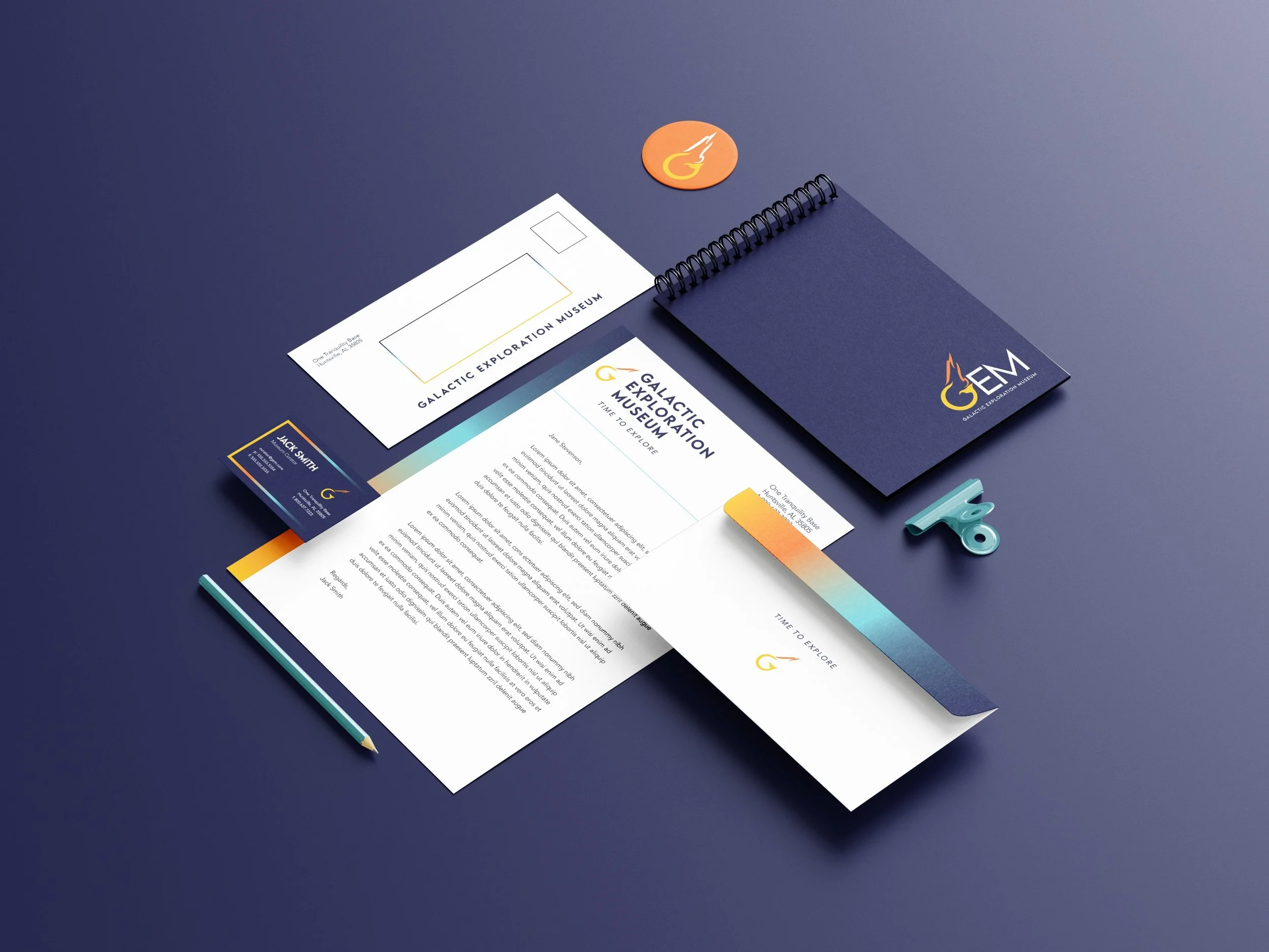The U.S. Space & Rocket Center is an aerospace museum located in Huntsville, AL. Their former branding was extremely technical rather than imaginative. Their logo was complex and too-high detailed, and their monochrome red/black/white color palette was mismatched to their institution. I took on this rebrand by starting with changing their name to the Galactic Exploration Museum, which encapsulates the kind of information they provide while adding an imaginative element that appeals to all age groups. The logomark and color palette are more dynamic, high contrast, and eye-catching. I applied this new system to a standard stationery set, along with tickets for various events at the museum itself.